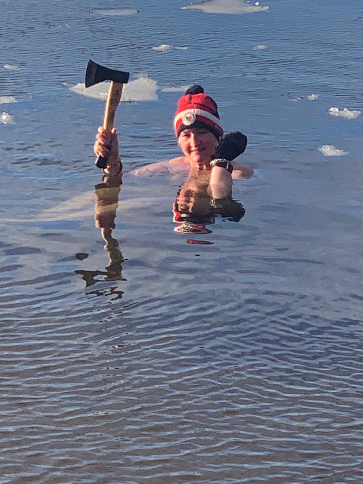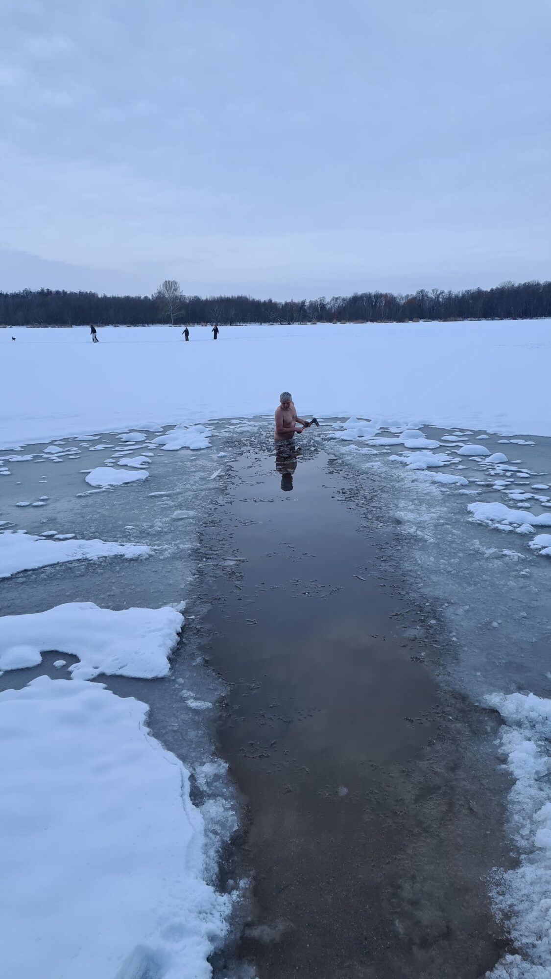 Členové klubu se nyní střídají na Jezeře s bruslaři v jedné díře. Pracujeme usilovně na jejím rozšíření na délku 750 metrů – už nám zbývá posledních 747 metrů a je hotovo!